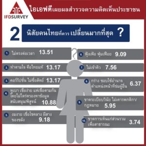 ไอเอฟดี ทำการสำรวจความคิดเห็นของประชาชน 1,194 คน ทุกภูมิภาคทั่วประเทศว่า นิสัยที่คนไทยควรเปลี่ยนแปลงมากที่สุด โดยมีตัวเลือกทั้งหมด 10 อันดับ ได้แก่ ไม่ตรงต่อเวลา ทำตามใจคือไทยแท้ คอร์รัปชั่น หูเบา งมงาย ฟุ้งเฟ้อ ไม่เข้าคิว ชอบใช้อำนาจข่มเหงผู้อื่น ขาดระเบียบวินัย และขาดการเห็นแก่ส่วนรวม ตามลำดับ โดยผลสำรวจพบว่า 3 อันดับแรกที่มีคะแนนสูงสุด คือ การไม่ตรงต่อเวลา การทำตามใจคือไทยแท้ และการคอร์รัปชั่น ตามลำดับ