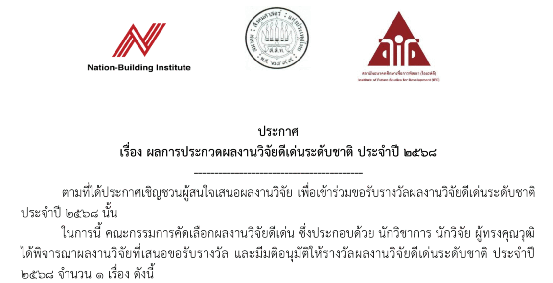 ตามที่ได้ประกาศเชิญชวนผู้สนใจเสนอผลงานวิจัย เพื่อเข้าร่วมขอรับรางวัลผลงานวิจัยดีเด่นระดับชาติ ประจำปี ๒๕๖๘ นั้น