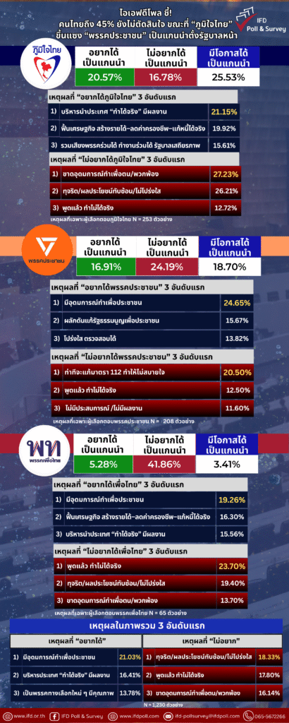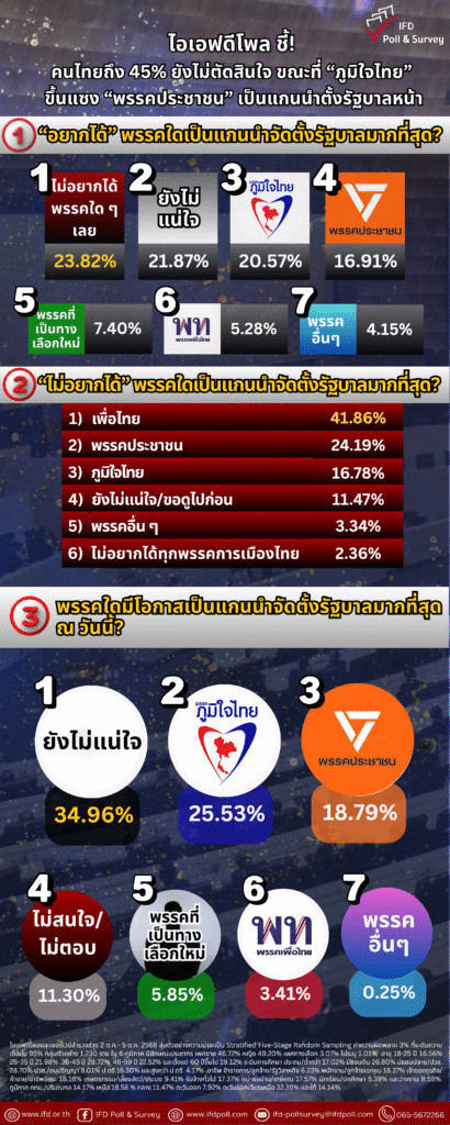 ไอเอฟดีโพลชี้! คนไทยถึง 45% ยังไม่ตัดสินใจ ขณะที่ “ภูมิใจไทย” ขึ้นแซง “พรรคประชาชน” เป็นแกนนำตั้งรัฐบาลหน้า