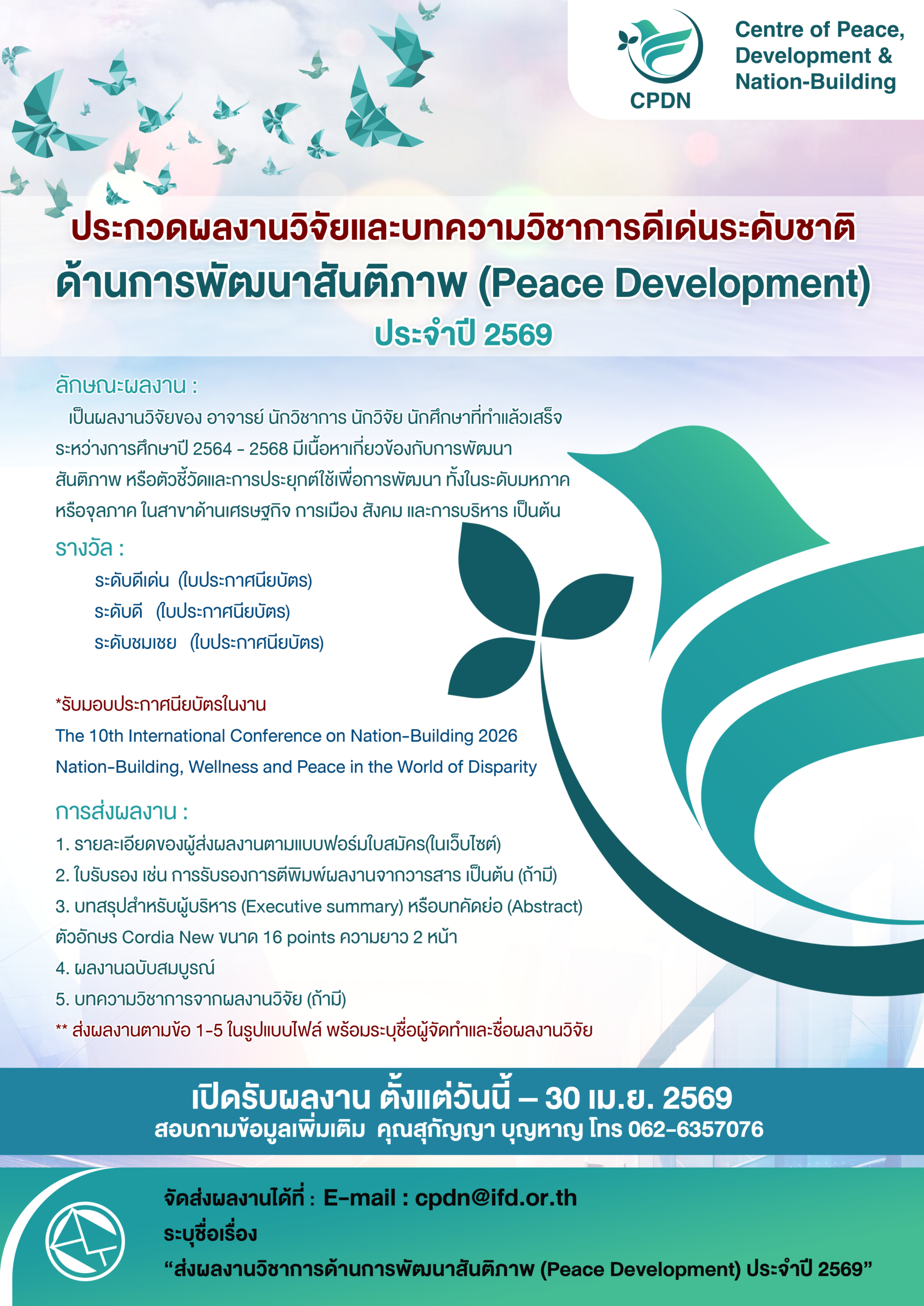 ประกวดผลงานวิจัยและบทความวิชาการดีเด่นระดับชาติ ด้านการพัฒนาสันติภาพ (Peace Development) ประจำปี 2569
