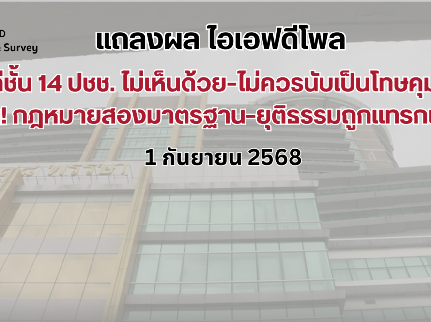 IFD Poll, การเมืองกันยายน 1, 2025ไอเอฟดีโพลชี้! “คดีชั้น 14 ปชช. ไม่เห็นด้วย–ไม่ควรนับเป็นโทษคุมขัง หวั่น! กฎหมายสองมาตรฐาน–ยุติธรรมถูกแทรกแซง”