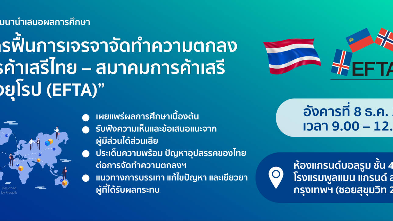 สถาบันอนาคตศึกษาเพื่อการพัฒนา (IFD) ร่วมกับ กรมเจรจาการค้าระหว่างประเทศ ขอเชิญผู้สนใจเข้าร่วมการสัมมนาในหัวข้อ "การฟื้นการเจรจาจัดทำความตกลงการค้าเสรีไทย-สมาคมการค้าเสรีแห่งยุโรป (EFTA)" โดยมีวัตถุประสงค์เพื่อเผยแพร่ผลการศึกษาเบื้องต้นและรับฟังความเห็น