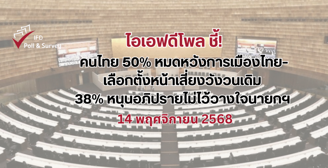 ไอเอฟดีโพลและเซอร์เวย์ สำรวจ 12 – 13 พ.ย. 2568 1,272 ราย ใน 6 ภูมิภาค สุ่มตัวอย่างความน่าจะเป็น Stratified Four-Stage Random Sampling ค่าความผิดพลาด 3% ที่ระดับความเชื่อมั่น 95% ลักษณะประชากร เพศ ชาย 44.18% หญิง 51.73% เพศทางเลือก 2.91% ไม่ระบุ 1.18% อายุ 18-25 ปี 18.87% 26-35 ปี 19.18% 36-45 ปี 22.09% 46-59 ปี 20.44% และตั้งแต่ 60 ปีขึ้นไป 19.42% การศึกษาสูงสุด ประถม/ต่ำกว่า 4.56% มัธยมต้น 23.19% มัธยมปลาย/ปวช. 31.92% ปวส./อนุปริญญา 17.69% ป.ตรี 18.47% และสูงกว่า ป.ตรี 4.17% อาชีพ ข้าราชการ/ลูกจ้าง/รัฐวิสาหกิจ 11.56% พนักงาน/ลูกจ้างเอกชน 21.23% ประกอบธุรกิจส่วนตัว/ค้าขาย 21.38% ช่วยธุรกิจ/งานครอบครัว 9.51% รับจ้างทั่วไป 10.22% แม่บ้าน/พ่อบ้าน/เกษียณ 7.00% นักเรียน/นักศึกษา 9.83% ว่างงาน 8.81% อื่นๆ 0.47% ภูมิภาค กทม./ปริมณฑล 14.46% เหนือ 18.40% กลาง 13.13% ตะวันออก 7.86% ตะวันออกเฉียงเหนือ 32.23% และใต้ 13.92%