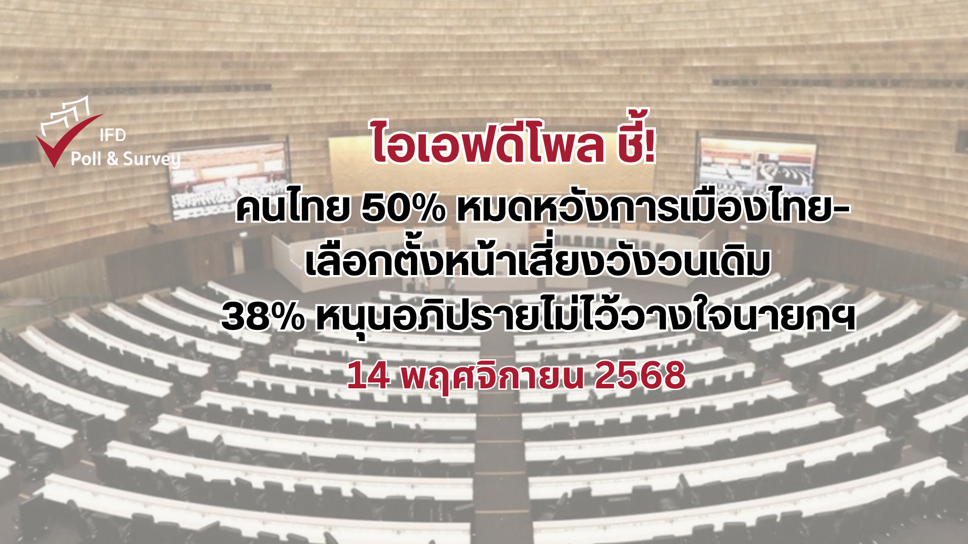 ไอเอฟดีโพลชี้ ! คนไทย 50% หมดหวังการเมืองไทย–เลือกตั้งหน้าเสี่ยงวังวนเดิม 38% หนุนอภิปรายไม่ไว้วางใจนายกฯ