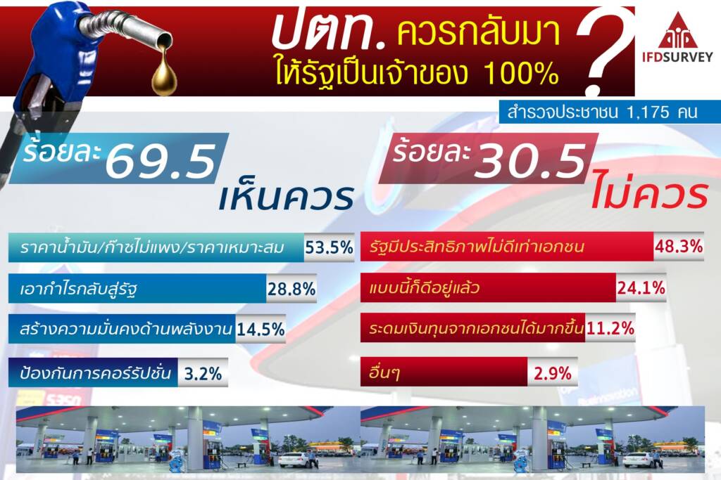 และเมื่อสอบถามข้อเสนอแนะของประชาชนเกี่ยวกับ ปตท. ว่าควรนำกลับมาให้รัฐเป็นเจ้าของ 100% เหมือนไฟฟ้า ประปา หรือไม่ พบว่าส่วนใหญ่ร้อยละ 69.5 เห็นว่า ปตท. ควรกลับมาเป็นของรัฐ 100% ส่วนอีกร้อยละ 33.2 เห็นว่าไม่ควรให้ ปตท. กลับมาเป็นของรัฐ 100% โดยประชาชนที่เห็นควร ส่วนใหญ่ร้อยละ 53.5 ให้เหตุผลว่า ราคาน้ำมันและก๊าซจะได้ไม่แพง ร้อยละ 28.8 เห็นว่าเพื่อเอากำไรกลับสู่รัฐ และร้อยละ14.5 เห็นว่าเพื่อสร้างความมั่นคงด้านพลังงานของประเทศ ขณะที่ประชาชนที่เห็นว่าไม่ควร ส่วนใหญ่ร้อยละ 48.3 ให้เหตุผลว่า ประสิทธิภาพในการดำเนินงานของรัฐไม่ดีเท่าเอกชน ร้อยละ 24.1 บอกว่าแบบนี้ก็ดีอยู่แล้ว ร้อยละ 13.5 เห็นว่าเพื่อจะได้แข่งขันกับต่างประเทศได้ และร้อยละ 11.2 เห็นว่าทำให้สามารถระดมเงินทุนจากภาคเอกชนได้มากขึ้น