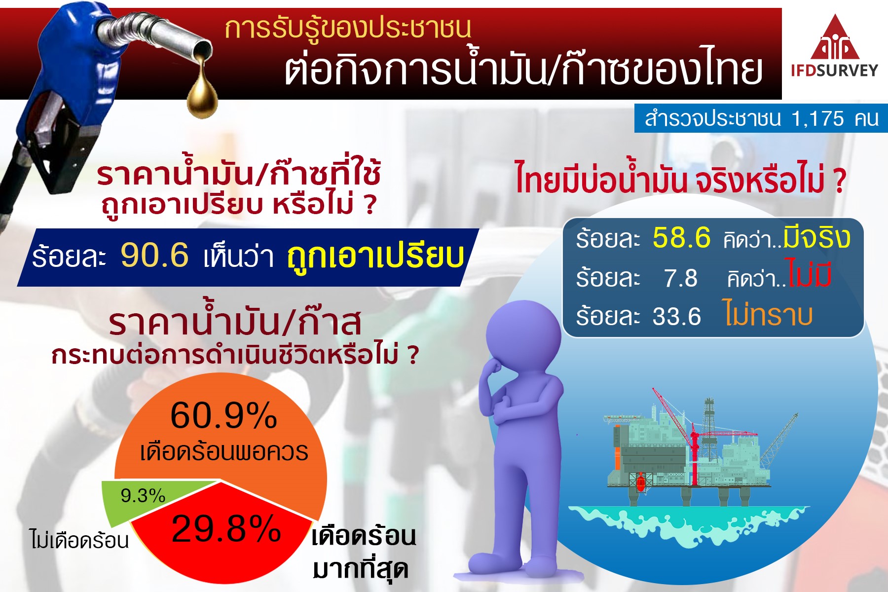 IFD Survey ได้สำรวจความคิดเห็นของประชาชน 1,175 คน ด้วยวิธีสุ่มตัวอย่างทุกภูมิภาคทั่วประเทศเกี่ยวกับการรับรู้ของประชาชนต่อกิจการน้ำมันและก๊าซของไทย ผลสำรวจพบว่า ประชาชนคิดว่าถูกเอาเปรียบเรื่องราคาน้ำมันหรือก๊าซที่ใช้อยู่ที่ร้อยละ 90.6 โดยมีประชาชนที่ได้รับผลกระทบต่อการดำเนินชีวิตและความเดือดร้อนในระดับพอควรอยู่ที่ร้อยละ 60.9 และประชาชนที่ได้รับความเดือดร้อนระดับมากที่สุดอยู่ที่ร้อยละ 29.8 ทั้งนี้ ประชาชนร้อยละ 58.6 คิดว่าประเทศไทยมีบ่อน้ำมันอยู่จริง ขณะที่ร้อยละ 33.6 ยังไม่ทราบแน่ชัด อีกร้อยละ 7.8 คิดว่าไทยไม่มีบ่อน้ำมัน