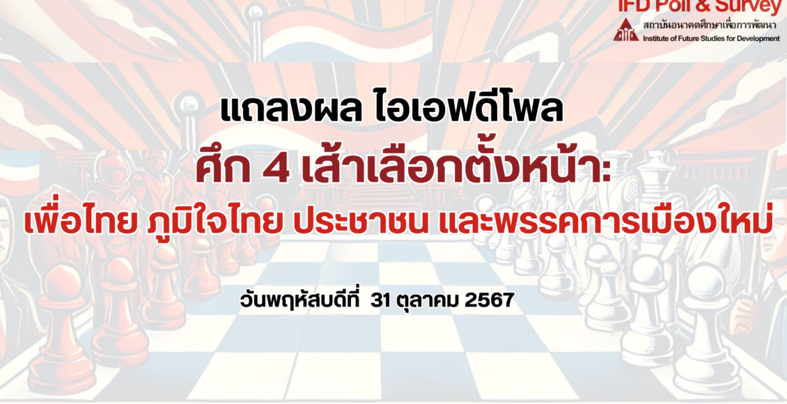 ไอเอฟดีโพลและเซอร์เวย์ สถาบันอนาคตศึกษาเพื่อการพัฒนา (IFD) สำรวจความเห็นประชาชนไทยตั้งแต่ 18 ปีขึ้นไป เรื่อง “ศึก 4 เส้าเลือกตั้งหน้า : เพื่อไทย ภูมิใจไทย ประชาชน และพรรคการเมืองใหม่” จำนวน 1,233 ตัวอย่าง สำรวจช่วง 17-23 ตุลาคม 2567 ใน 6 ภูมิภาค ด้วยวิธีสำรวจภาคสนามและโทรศัพท์อย่างละ 50% สุ่มตัวอย่างความน่าจะเป็น Stratified Five-Stage Random Sampling ค่าความผิดพลาด 3% ที่ระดับความเชื่อมั่น 95%